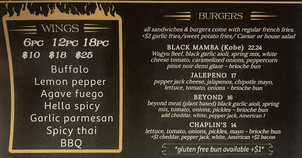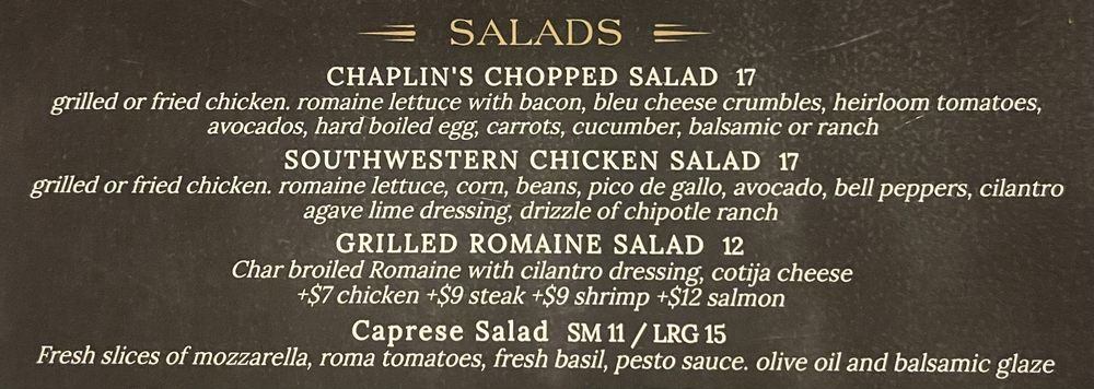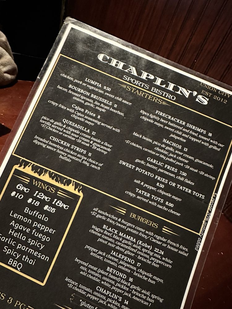 Chaplin’s Sports Bistro Menu (Update 2025)